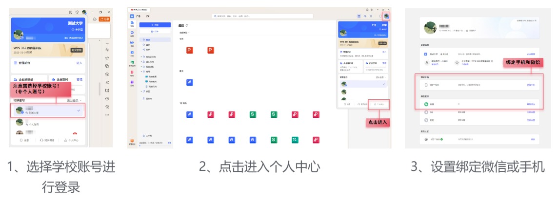 绑定方式:以下示例为电脑版,手机端请在WPS-进入底部“我”-进入账号与安全中设置手机和微信。