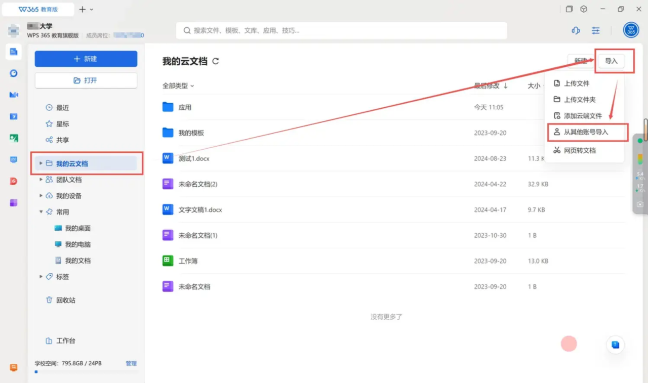 解决办法:登录湖北理工学院账号后,进入WPS首页-云文档-导入-从其他账号导入,快速迁移个人文档