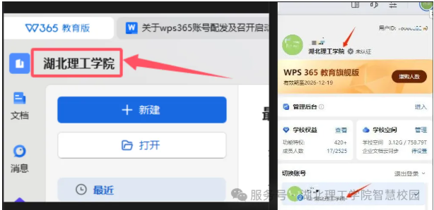 完成首次认证登录后WPS首页左上角、点击个人头像详情页会显示“湖北理工学院”标识