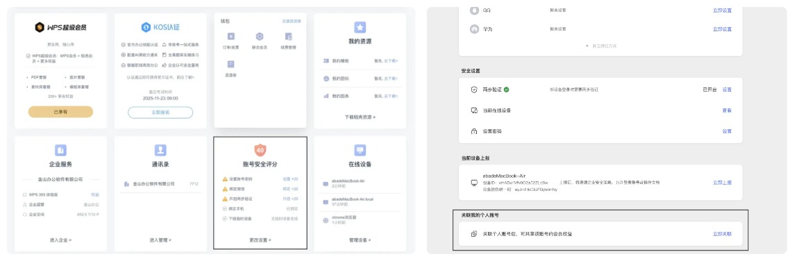 解决办法:如您的个人账号已开通超级会员,可在湖北理工学院专属账号下关联您的个人账号,进入WPS-点击头像-进入账号安全评分-更多设置,快速绑定个人账号。学校账号可免费获得个人账号的所有非消耗类会员权益和稻壳权益,反之个人账号无法获得学校账号权益。