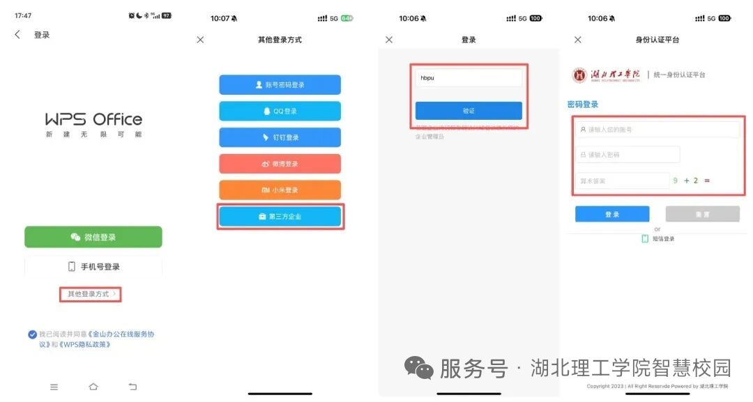 移动端打开上面第2步下载安装的WPS Office后,点击【其他登录方式】—【第三方企业代码】,输入学校代码【hbpu】(不区分大小写)点击验证,通过学校统一身份认证登录系统登录激活。